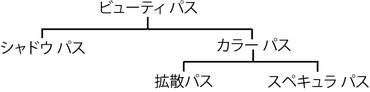 このパスは、シャドウ パスやカラー パスで作成されたコンポーネントを正しくレンダーします。また、カラー パスは、拡散パスやスペキュラ パスで作成されたコンポーネントを正しくレンダーします。したがって、結果的にビューティ パスがコンポーネントのすべてを正しくレンダーすることになります。