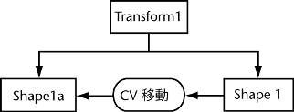 |Transform1|Shape1 がオリジナルのオブジェクトですが、|Transform1|Shape1a が、UI ウィンドウで可視になる、実際のオブジェクトです。|Transform1|Shape1 は中間オブジェクトとも呼ばれ、後でディペンデンシー グラフを操作するときに重要となります。