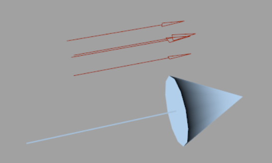 シンプルな例を apiDirectionalLightShape サンプル プラグインに示します。このプラグインは、次のカスタム ジオメトリ(青色)をディレクショナル ライトの既定の内部描画と比較して描画します。