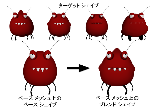 - 「ブレンド シェイプ」は、ターゲット シェイプがベース オブジェクトに適用されることにより得られるシェイプです。各ターゲット シェイプのウェイトを変更して、ブレンド シェイプへの影響度を変更することができます。