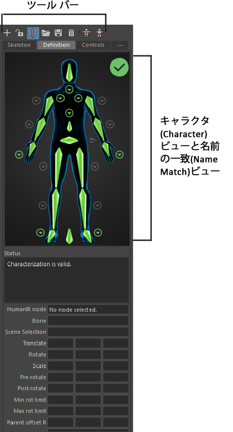 定義(Definition)タブには、既存のスケルトンの構造をマッピングするためのビジュアル インタフェースが入っています。このプロセスの結果、HumanIK スケルトン定義(コントロール リグの作成)が作成されます。
