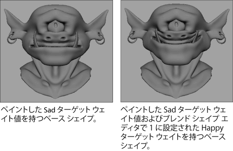 このツールを使って、頂点ごとにブレンド シェイプ ウェイトを設定できます。つまり、ベース シェイプ上にターゲット シェイプが与えるインフルエンスの程度を、よりきめ細かくコントロールできます。また、このツールにより、ターゲット シェイプごとにウェイトをペイントすることも、ターゲット シェイプをミックスしたり、部分的なターゲットを作成することもできます。