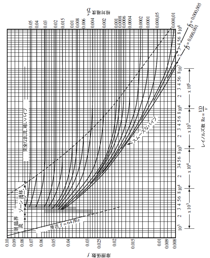 出典: L.F. Moody, "Friction factors for Pipe Flow (配管の流れの摩擦係数)", Trans. A.S.M.E., Vol 66, 1944