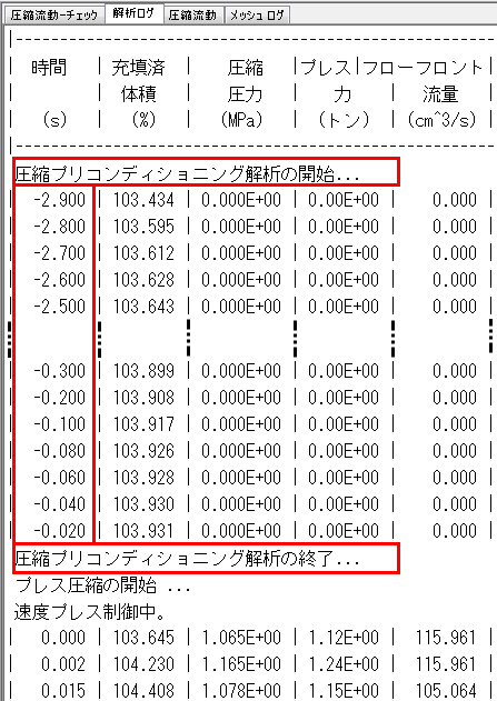 ログ ファイルでは、解析のプリコンディショニング段階は、- (遅延時間)から 0 までの負数で示されます。
