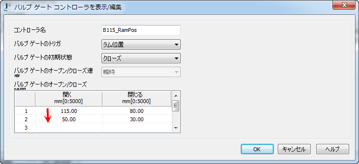 - [バルブ ゲートのオープン/クローズ時間]テーブルに適切な値を入力して、これらの値が、すでに[プロセス設定]ダイアログ ボックスに入力してある値と一貫していることを確認します。