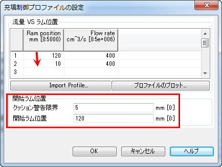 - [OK]をクリックして、[充填制御プロファイルの設定]ダイアログ ボックスを閉じます。