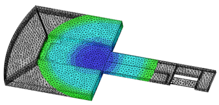 ここでも、スケール バー上限の変更に合わせてモデルの色付けが変更されました。グレーの領域が、特定の時間において温度の色分け範囲外にある金型のセクションを示しています。成形品を、成形品裏面のリブ セクションが見えるように回転させます。