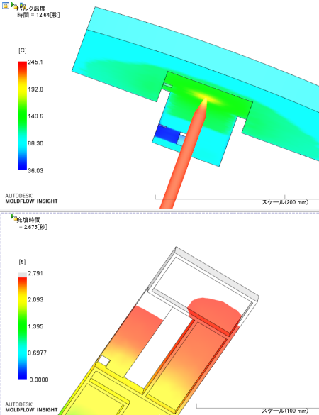 モデルの末端を充填するまでに要した時間に差があることがわかります。これにより、最初に充填したセクションで過充填が発生する場合があります。