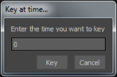 Key at time オプションをオンにすると、Key at time ダイアログ ボックスが開かれ、現在の時間に関わりなく、選択したプロパティの 1 つまたは複数のキーフレームを任意の時点で設定できます。