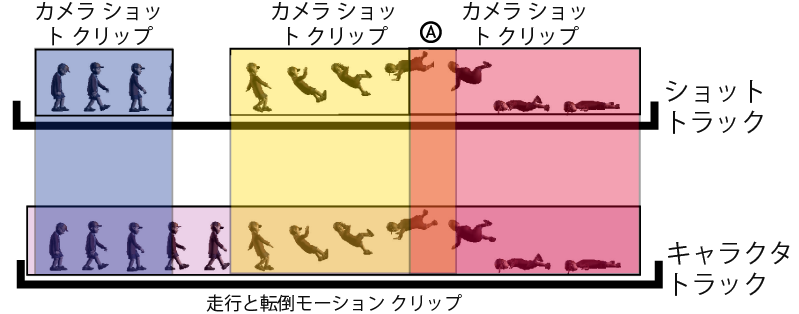 Action タイムライン上の Character トラックのアクションの対応する領域をカバーする、Edit タイムライン上のカメラ ショット A. 2 つのカメラ ショットがブレンドされ、クロス ディゾルブが作成されています。