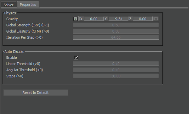 物理ソルバの Properties ペインでは、基本的なコンストレイントまたはソルバの動作を制御する既定の規則を指定できます。