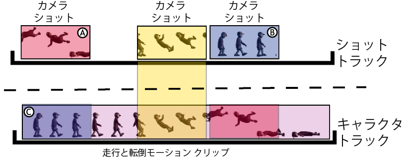 以下の図では、キャラクタが歩いていて、滑るシーンは通常の順序で表示されています。各ショット クリップは、下の Character トラック上のアクションの一部をカバーしています。つまり、キャラクタが歩き始める部分が最初の Camera ショット クリップによってカバーされ、キャラクタが滑る部分が 2 番目の Camera ショット クリップに、キャラクタが転ぶ部分が 3 番目の Camera ショット クリップによってカバーされます。