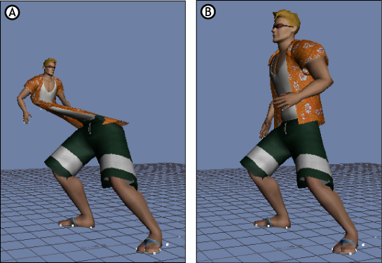 たとえば、上の図は、Local Blending オプションをオンにする前後のキャラクタを示しています。1 つのカットはキャラクタのボディの上部を、別のカットはボディの下部をそれぞれアニメートします。Local Blending オプションをオフにすると、ボディの上部と下部のアニメーションが正しくブレンドされません。Local Blending オプションをオンにすると、キャラクタを歪めることなくアニメーションのブレンドが行われます。