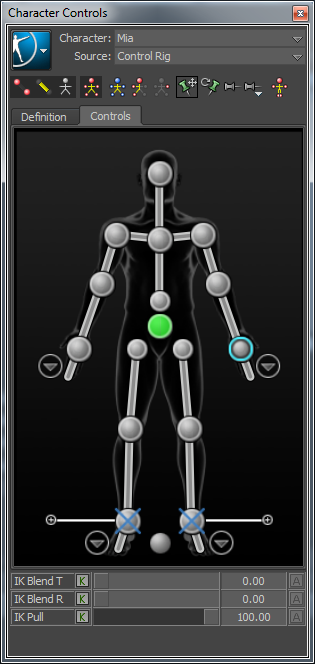 | 現在のキャラクタのアニメーション ソースを設定する | Source メニューから HumanIK 定義キャラクタを名前別に選択します。 | |
