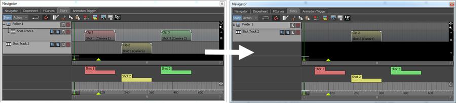 次のイメージでは、Display Minimized Action Shot Clips がオフになっています。関連付けられたショット クリップを含むフォルダが折りたたまれている場合、ショットは表示されません。