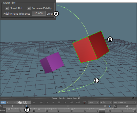プロット A. Fidelity Keys Tolerance フィールド B. Cube1 C. オリジナルのアニメーションに類似した Cube1 の軌跡 D. Cube1 にプロットされたキーフレームがオリジナルのアニメーションを再作成します。