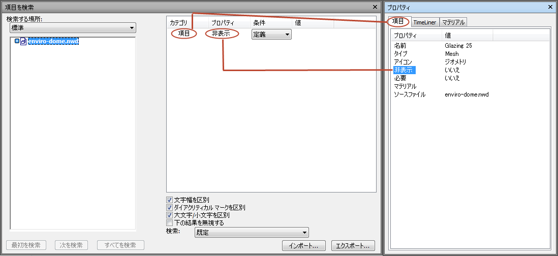 このプロセスで重要な部分は、[項目を検索]ウィンドウで特定のモデル プロパティを持つ項目を検索し、それらのプロパティを XML ファイルにエクスポートし、それらを修正して、選択した数量拾いプロパティをマッピングすることです。[項目を検索]ウィンドウと[プロパティ]ウィンドウを並べて表示すると便利な場合があります。