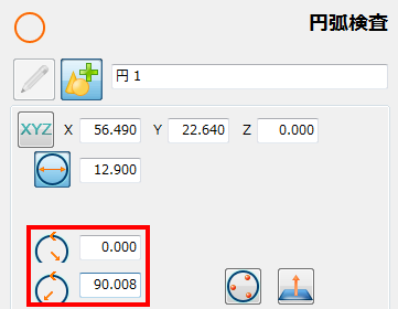 PowerInspect によって、[円弧検査]ダイアログに、規定開始角度、および、規定終了角度が表示されます。