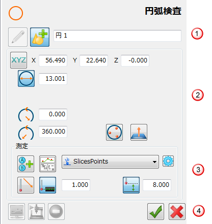 表示されるダイアログは、選択したアイテムのタイプによって異なります。アイテムで使用可能なオプションは、検査を作成している対象のマシンのタイプによって異なります。次の例は、CNC マシンの検査用に円アイテムを作成または編集するときに表示されるダイアログを示しています。