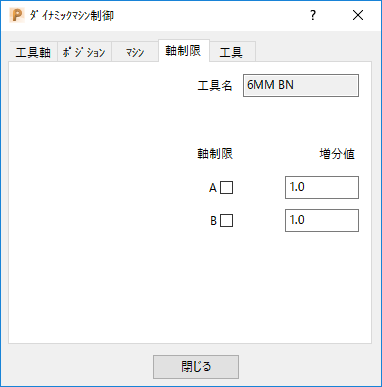 ダイナミックマシン制御 モードダイアログ 軸制限 タブを使用し、実際の機械軸の増分値を入力することにより、バーチャル機械軸がより正確に移動できるようにします。