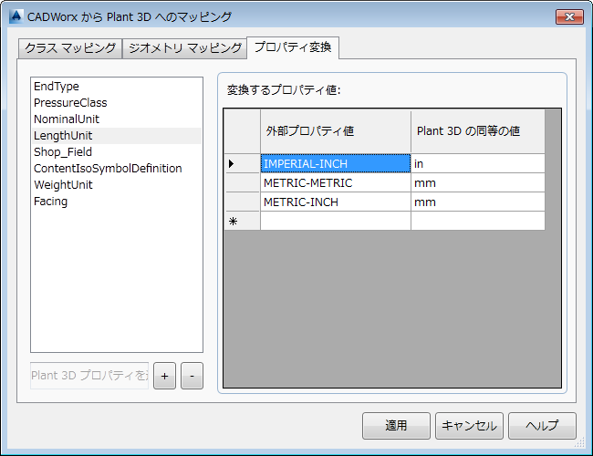 CADWorx スペックから値を受け取り、変換が必要な、追加された Plant 3D プロパティの一覧を表示します。