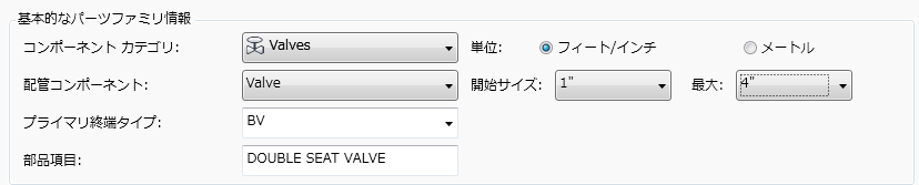 - [基本パーツ ファミリ情報]で、コンポーネント カテゴリ([バルブ]など)をクリックします。