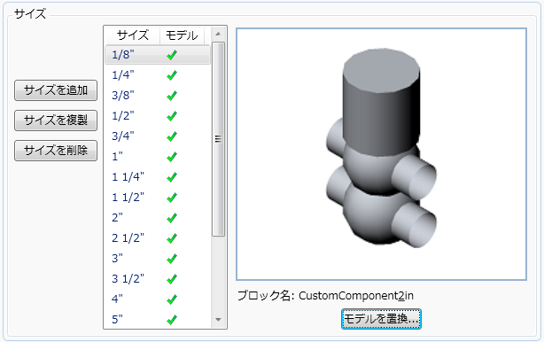 カタログ エディタで、カスタム ジオメトリを使用するコンポーネントを作成します。新しいコンポーネントの配管コンポーネント クラスと、その他の固定プロパティを指定します。初期サイズ範囲を生成します。カスタム コンポーネント ブロックに一致するようにサイズを追加および削除します。各サイズのカスタム ジオメトリを読み込みます。
