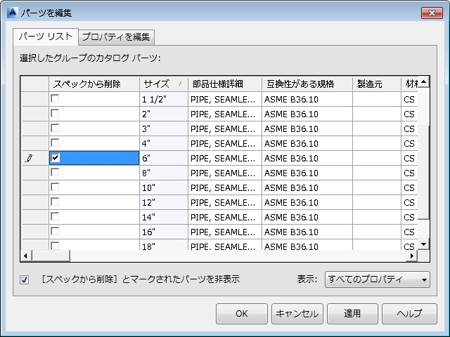 1. スペック エディタの[スペック シート]ペインで、パーツ(例: [PIPE、PE、ASME B36.10])をクリックします。