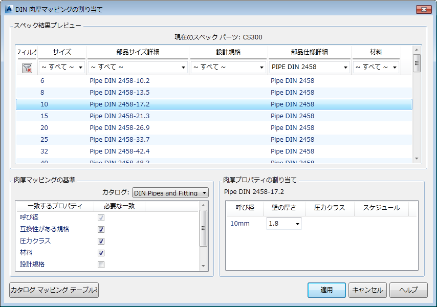 DIN カタログ コンポーネントの肉厚マッピング基準を割り当てます。