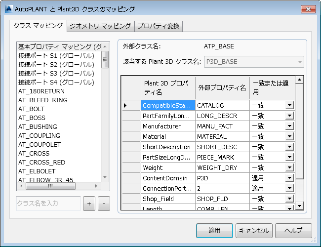 グローバルで個別のクラス AutoPLANT プロパティを Plant 3D の対応するプロパティにマッピングします。