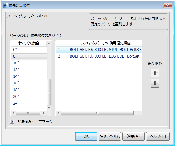 パーツ サイズを指定します。パーツ サイズを指定すると、[優先順位]または[解決済みとしてマーク]を設定できるようになります。解決済みとしてマークするサイズの競合を複数選択できます。