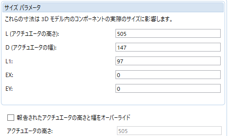 - [サイズ パラメータ]セクションでアクチュエータの高さまたはアクチュエータの幅を変更すると、下部のセクションの対応する値も変更されます。