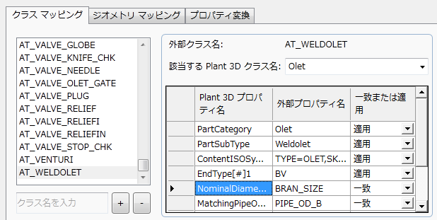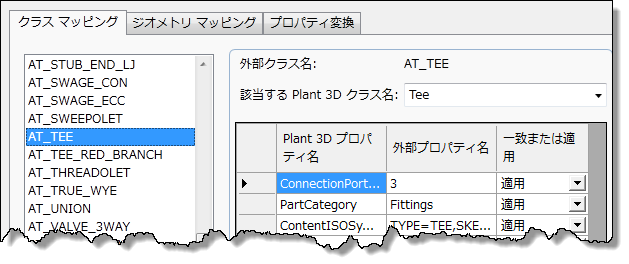 部品仕様、圧力クラス、スケジュールなどのグローバル プロパティは、すべてのクラスについて一度にマップすることができます。これに対し、個別のクラス プロパティは、対応する Plant 3D クラス プロパティに 1 対 1 でマップされます。
