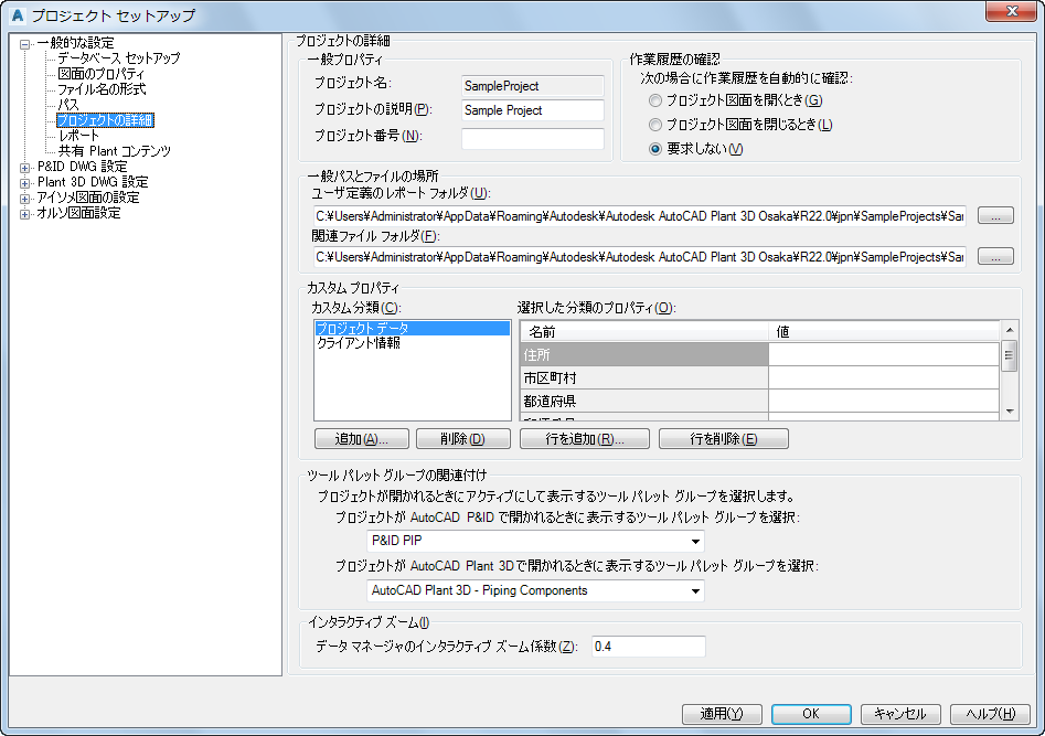 コンポーネントの記号、タグ付けルール、注釈プロパティ、画層、色など、プロジェクトや作図の基本設定を設定します。