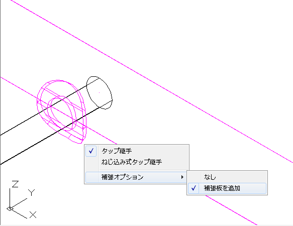 ブランチ接続を作成するときに、スタブインを指定できます。スタブインを作成した後は、補強パッドを追加できます。