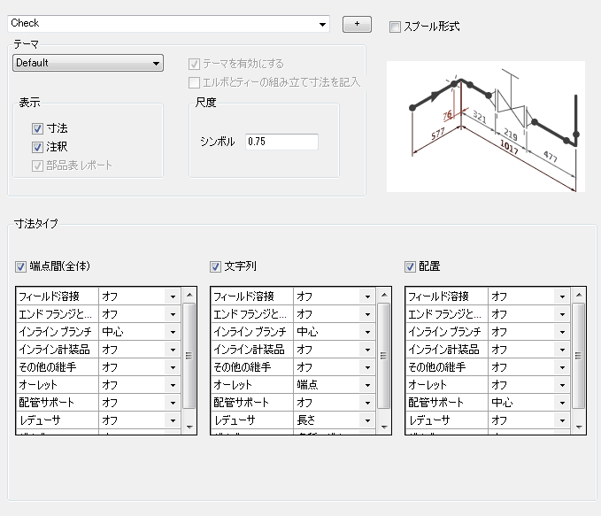 配管テーマや優先するテーマの寸法、注釈、アイソメ シンボルの尺度を指定することができます。