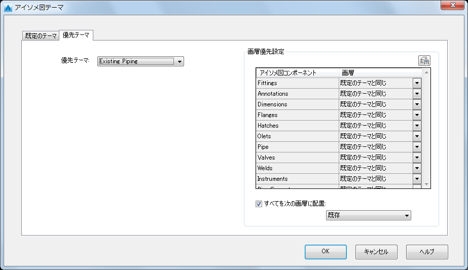 アイソメ図コンポーネントそれぞれが表示される画層を指定します。既定では、すべての画層は[既定のテーマと同じ]に設定されます。コンポーネント リストには、継手、フランジ、ハッチング、断熱材、計装、配管、オーレット、バルブなどが含まれます。グローバル コンポーネント(タブレットなど)は除外されます。