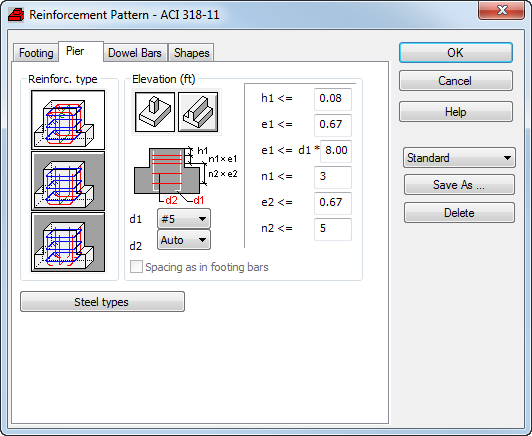 Defines the horizontal reinforcement diameter (for footing) and vertical (for footing and continuous foundation) for piers.