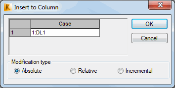 For example, the available load cases include numbers 1, 3, 5, 6, 7. The cases 5, 6, and 7 should be changed to 2, 3, and 4. To do so, select the records 5, 6, and 7 in the Case column. Right click and select Fill Special. Select the modification type (Absolute) and enter 2. Cases 5, 6, and 7 change to 2,3, and 4. Case 3 will be assigned the first free number outside the block.