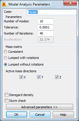 Click Advanced parameters >> to access additional modal analysis parameters for a load case: