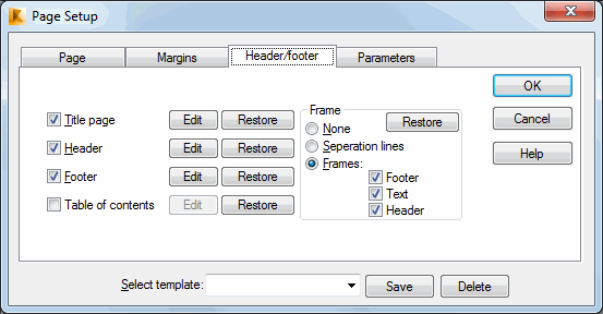 To save Header/footer settings, enter a name in the Select template field and click Save.