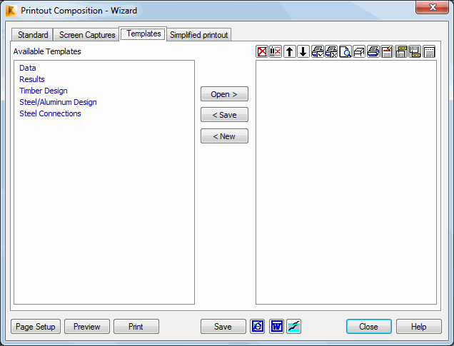 The dialog is divided into Left and Right panels. The left panel presents printout templates. The templates contain structure views/drawings and appropriately arranged data/results tables. Some templates have the node/bar selection activated. Predefined templates are presented in the left panel in blue. They cannot be removed, although they can be overwritten. User-defined templates replace existing templates and change to black. If the user-defined template is deleted, the original default template will be restored in its place.