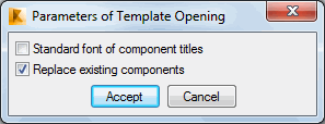 Click Open to open a template. A small dialog will open. If Standard Font of Component Titles is inactive (this is the default), the font of the titles of particular printout components will be identical with those of the opened template. If active, titles will be presented with the user defined fonts in the Preferences dialog. If the Replace existing components option is selected (this is the default), then elements of the selected template will be placed in a printout, while existing printout elements will be deleted. If this option is inactive, then elements of the selected template will be added at the end of the existing printout.
