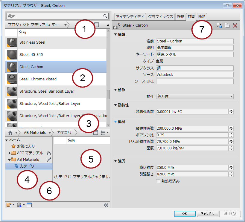 | 7 | ライブラリのリスト(左ペイン)でマテリアルを選択すると、このマテリアルに関連付けられたタブ(アセット)が右ペインに表示されます。マテリアルのプロパティとアセットを表示するには、タブ(たとえば、[識別]または[外観])をクリックします。ライブラリのマテリアルを表示している間、プロパティは読み取り専用になります。 |