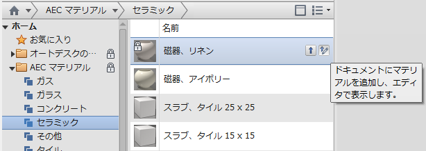 ボタンをクリックします。このボタンは、ライブラリのマテリアルをプロジェクトのマテリアル リストに追加します。