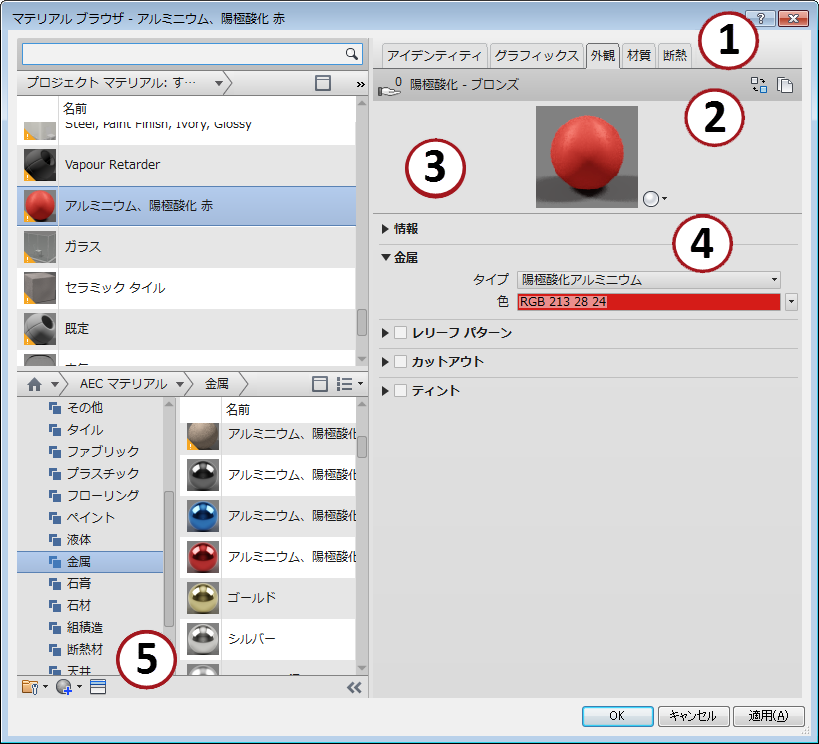 | 4 | [プロパティ]パネル: 選択したアセットの詳細なプロパティを表示、管理します。アセットの名前と説明は[情報]ドロップダウン パネルの下に表示されます。上の例では、「Anodized - Red」の[外観]アセットで表示(拡張)される[メタル]プロパティを表しています。 |