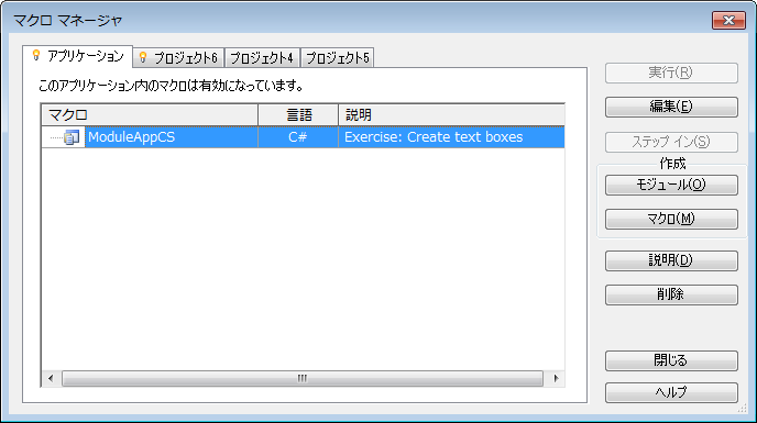 - [アプリケーション]タブ(アプリケーションレベル マクロの場合)または[プロジェクト]タブ(ドキュメントレベル マクロの場合)を選択します。