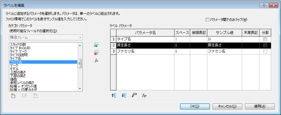 [カテゴリ パラメータ]ウィンドウには、タグ タイプに関連するラベル パラメータが入っています。[ラベル パラメータ]ウィンドウには、ラベルに表示される[カテゴリ]パラメータが入っています。通常、これは単一のパラメータですが、複雑で連結されたラベルを列挙することができます。