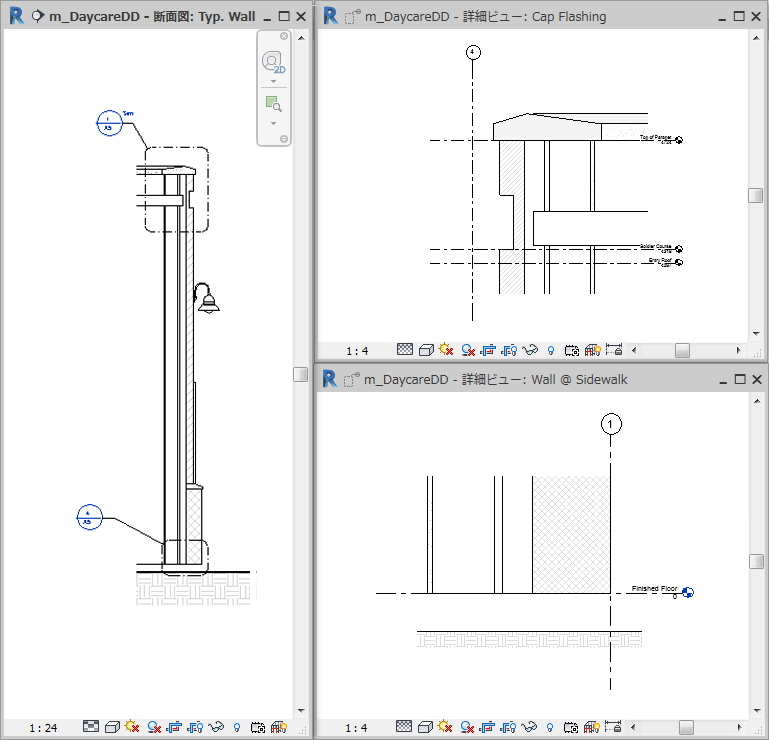 平面図ビュー、断面図ビュー、詳細ビュー、立面図ビューに詳細吹き出しまたは吹き出しビューを追加できます。ビューに吹き出し領域線を描画すると、Revit は、吹き出しビューを作成します。次に、その吹き出しビューに詳細を追加すると、建物モデルのその部分について詳細な情報を提供できます。