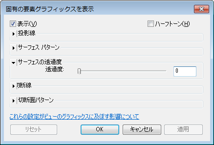 - サーフェスの透過性: 要素の線だけを表示し、サーフェスは表示しません。サーフェスの透過性のパーセンテージを設定するには、[透過性]スライダを使用します。